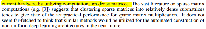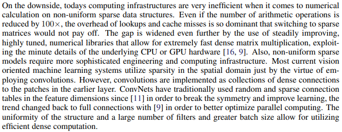 오늘날의 연산은 sparse한 데이터 구조에 효율적이지 않다. 연산량을 100배나 줄였음에도 불구하고, lookup에 대한 오버헤드나 cache miss(hit가 나지않는)로 인해 효과가 없었다. 최근의 비전 지향 머신러닝 시스템은 convolution을 사용하는 덕분에 spartial domain에서 sparsity를 활용한다. 하지만, convolution들은 이전 레이어의 패치에서 dense 연결의 집합들로 구현되어 있다.