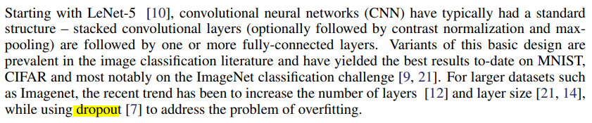 LeNet-5로 시작하여, CNN은 표준 구조(하나 이상의 FC 레이어가 따라오는 겹쳐진 convolution 레이어들)를 가지고 있다. ImageNet처럼 데이터셋이 커질수록 레이어의 숫자 및 크기도 늘어나는 추세이다. 그에 따라 overfitting이 발생하는데, 이를 dropout으로 해결한다.