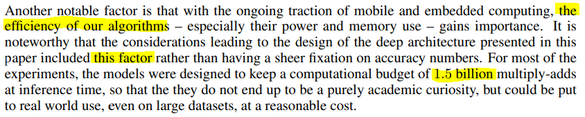 GoogLeNet은 단순한 정확도라는 숫자에 대한 집착보다는 알고리즘의 효율성에 대한 내용을 포함한다. 연산량은 15억번으로 유지한다.