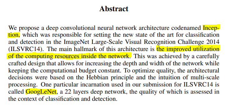 Google에서 설계한 GoogLeNet은 22개의 레이어로 구성되어 있다. 이 아키텍처의 특징은 네트워크 내부의 컴퓨팅 자원의 활용도를 개선한 것이다. (네트워크의 깊이와 너비를 증가시키면서도 연산량을 유지했다는 점)