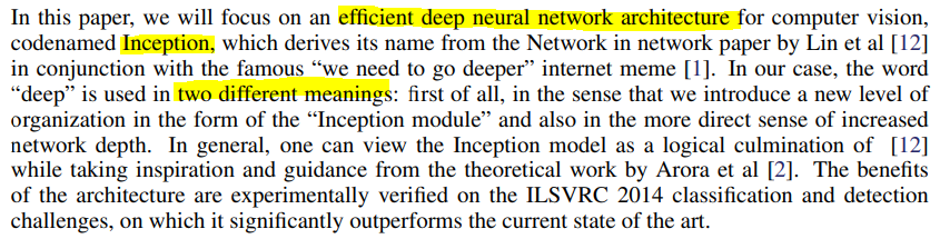 - 'Inception module' 이라는 새로운 구조를 도입한다는 의미.