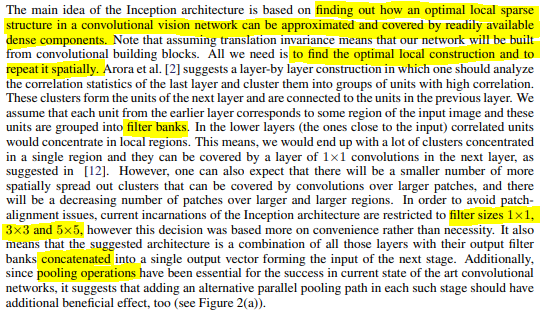 인셉션 구조의 핵심 아이디어는 모델 아키텍처를 최적의 local sparse structure로 근사하는 것과 dense component로 이를 처리하는 것이다. 결론적으로 해야할 것은 최적의 local construction을 찾고 이를 반복하는 것이다. 본 논문에서 제안하는 local construction은 $1 \times 1$, $3 \times 3$, $5 \times 5$ convolution연산과 pooling operation이 들어가고, 이를 concatenate한다. 입력과 가까운 낮은 레이어에서는 local region에 집중하기 때문에 $1 \times 1$ convolution로 처리될 수 있다. 하지만, 고차원이 레이어로 갈수록 연관된 유닛(sparse neuron)끼리 cluster되면서 larger region에 집중하기 때문에 $3 \times 3$, $5 \times 5$ convolution을 포함한다. 즉, 여러 관점에서 feature를 추출하기 위한 것이다.