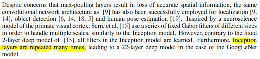 Max Pooling 레이어로 인한 공간 정보의 손실에 대한 걱정에도 불구하고, AlexNet과 같은 CNN 아키텍처에서는 성공적으로 localization, object detection, human pose estimation을 잘 수행한다. 영장류의 시각 피질로부터 영감을 받아 다양한 스케일을 처리하기 위해 다른 사이즈들의 Gabor filter들을 사용한다. 이러한 레이어를 Inception layer라고 부르며, 반복적으로 쌓아나간 것이 GoogLeNet이다.