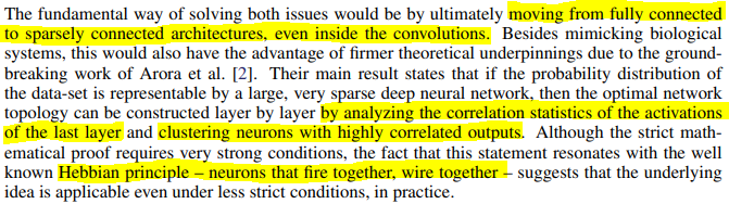 이러한 문제점들을 근본적으로 해결할 수 있는 방법은 convolution을 포함하여 fully connected를 sparse(불필요한 연결을 하지 않음)하게 바꾸는 것이다. 최적의 신경망을 구축하는 방법은 마지막 레이어의 활성화 값의 상관관계 통계를 분석하고, 높은 연관이 있는 출력의 뉴런들끼리 클러스터링하는 것이다. Hebbian principle(관련있는 뉴런들은 연결되어있다.)에 따르면 이 아이디어는 실제 상황에서도 적용가능한 아이디어다.