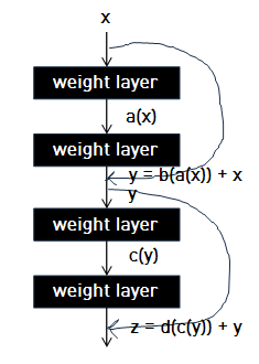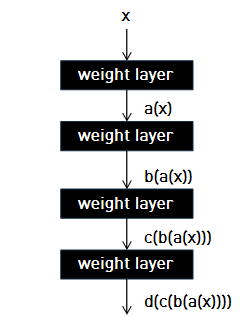 쉽게 설명하면, 왼쪽의 그림이 underlying mapping (original mapping), 오른쪽 그림이 residual mapping이다. 만약 original mapping의 경우 shortcut connection이 없으므로 비선형 함수의 모음인 $d(c(b(a(x))))$를 한번에 학습해야 한다. 하지만, residual mapping의 경우 shortcut connection이 있으므로 $b(a(x))$와 $d(c(y))$를 따로 학습할 수 있다.