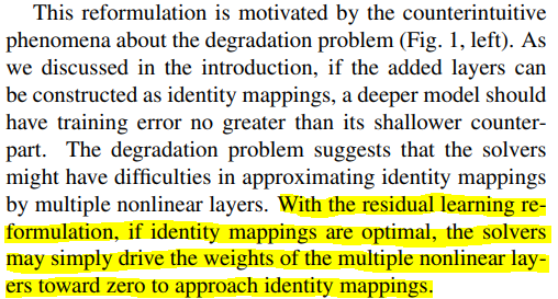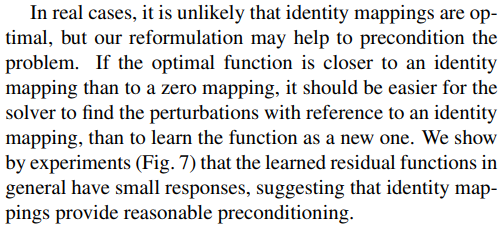 이러한 가정은 shortcut connection이 identity mapping이 최적이라고 가정할 때, identity mapping에 접근하기 위해 다중 비선형 레이어의 가중치를 0으로 쉽게 유도할 수 있다. ($F(x)$를 0으로 만드는 것을 초점으로 학습하기 때문에 학습 난이도가 낮아진다.)