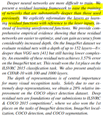 신경망의 깊이가 깊어질수록 학습에 어려움이 존재한다. 해당 논문에서는 residual learning framework (잔차 학습 프레임워크)를 통해 신경망이 깊어지더라도 학습을 쉽게 할 수 있음을 제안한다. 해당 방법은 기존의 unreferenced functions 대신 인풋 레이어를 참조하는 (referenced) residual function을 학습하도록 명시적으로 수식을 다시 정의한다. (이 부분에 대해서는 뒷 부분에서 그림을 통해 다시 쉽게 설명할 것이다.)
