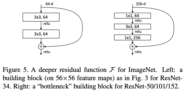 위 그림에서 좌측이 처음에 소개한 building block architecture이고, 우측이 bottleneck architecture이다. 우측처럼 설계한 이유는 학습시간을 고려한 까닭이다. Network In Network 논문 리뷰에서도 언급했다시피 $1 \times 1$ convolution 연산은 차원을 조절하기 위한 목적으로 존재한다. (첫 번째 $1 \times 1$ conv는 차원을 줄이고 두 번째 $1 \times 1$ conv는 차원을 늘려 원래대로 복원)