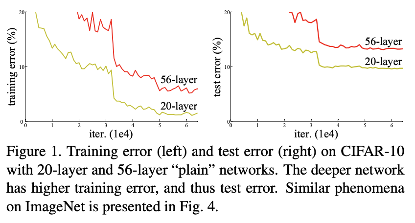 레이어가 깊어질수록 그레디언트 소실 및 폭주(gradient vanishing, exploding)과 같은 문제로 학습이 쉽게 되지 않았다. 이러한 문제는 초기화 기법(initialization)과 정규화 기법(normalization layers)를 통해 해결되었다. 하지만, 그럼에도 불구하고 신경망이 수렴할 수 있을 때 degradation 문제가 발생했다. degradation 문제는 신경망의 깊이가 증가함에 따라 정확도가 수렴하고 빠르게 급감하는 것을 의미한다. 그리고 이러한 문제는 오버피팅에 의해 발생하는 문제가 아니다.