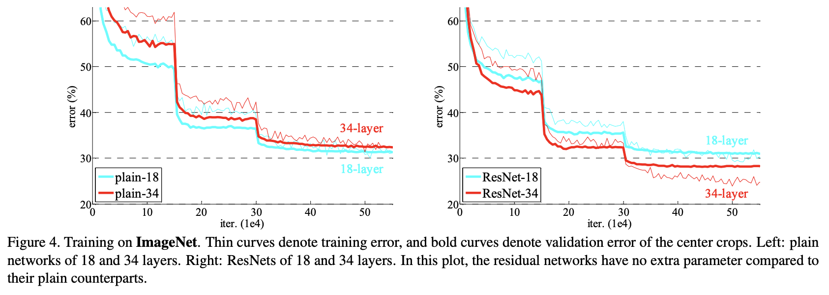 plain network 같은 경우에는 BN (Batch Normalization)을 사용하기 때문에 순전파가 0이 아닌 분산을 갖는 신호가 흐르는 것을 확인할 수 있다. 고로, vanishing gradient의 문제로는 볼 수 없다.