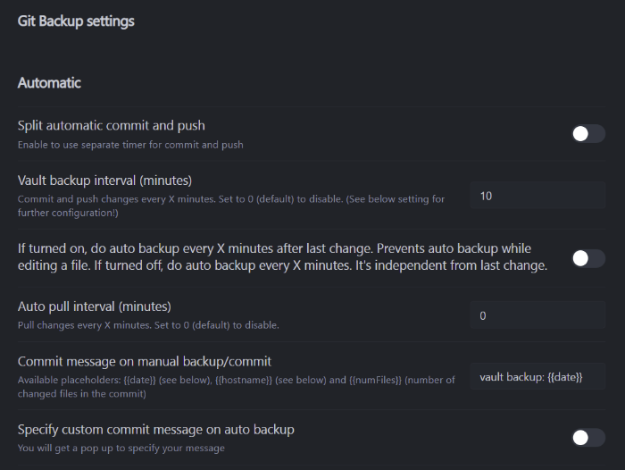 - Commit message on manual backup/commit : Push 할때 커밋 메시지의 양식을 지정합니다.