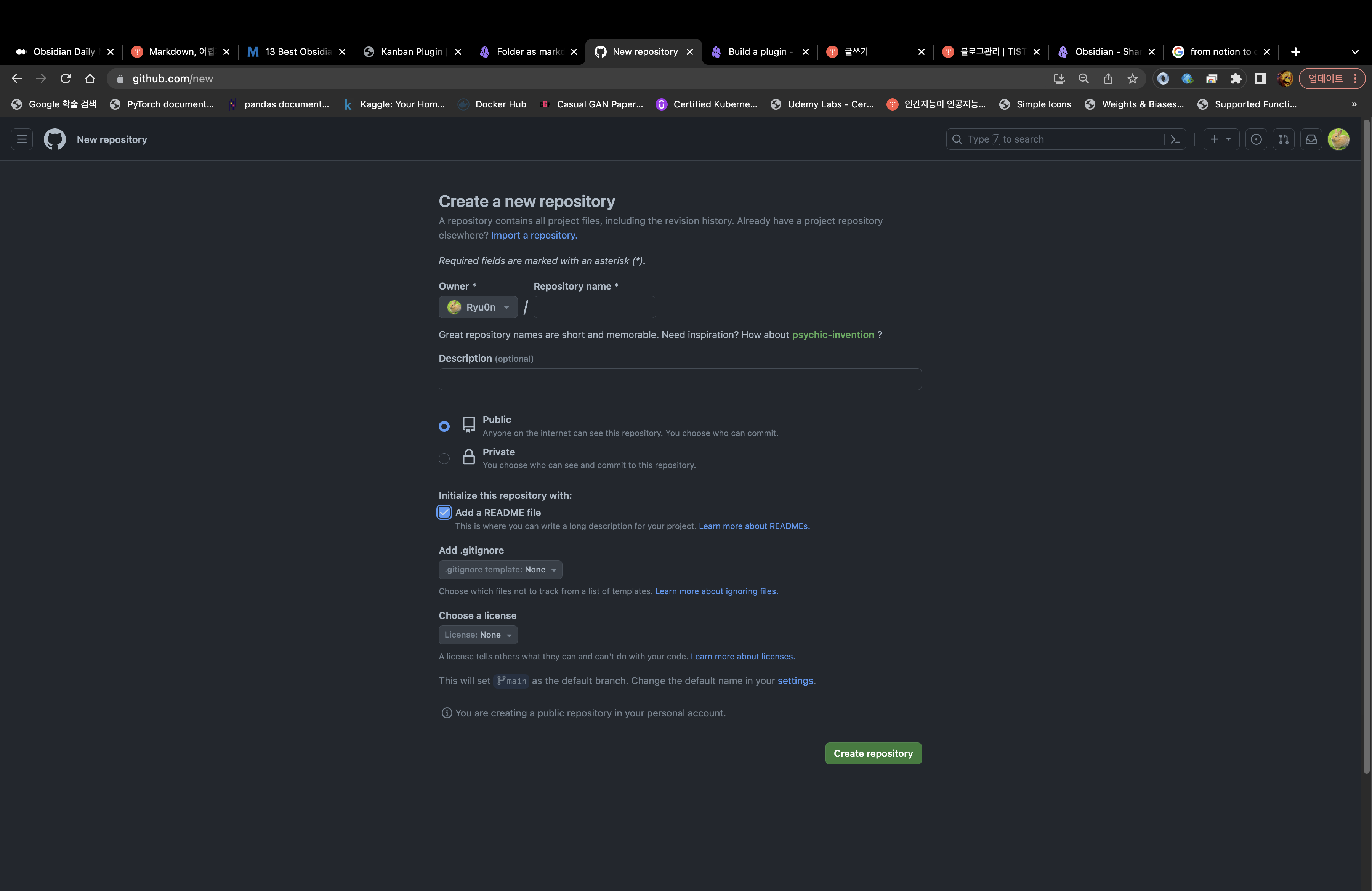- 옵시디언 볼트로 사용할 레포지토리를 생성합니다! 이름은 원하시는 걸로 입력하시고, 공개를 원치 않으면 Private를 체크!
