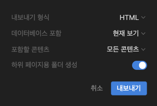 내보내기 형식을 HTML로 하셔야 합니다!! 논리적으로도 옵시디언은 마크다운 기반이니 마크다운으로 뽑아야 하는 것 아닌가? 싶은데 .. 옵시디언에 마이그레이션 하는 순간 재앙이 일어납니다. (Reddit에서도 이걸로 많이 삽질하는 것 같더라구요.. 개인이 만든 Convertor같은거 돌리거나..ㅋㅋ) 암튼 .zip 파일로 압축파일이 나올겁니다. 이제 그럼 노션에서는 더 이상 할일이 없습니다~