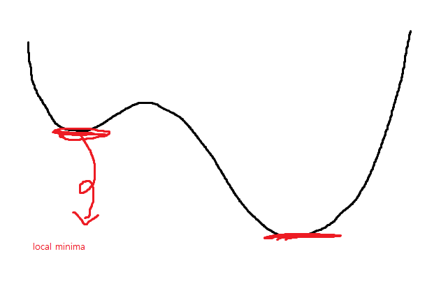 하지만, 그 옆에 더 깊은 기울기가 0인 지점이 존재하는 것을 모르고 local에 갇히는 것을 local minima 현상이라고 한다.