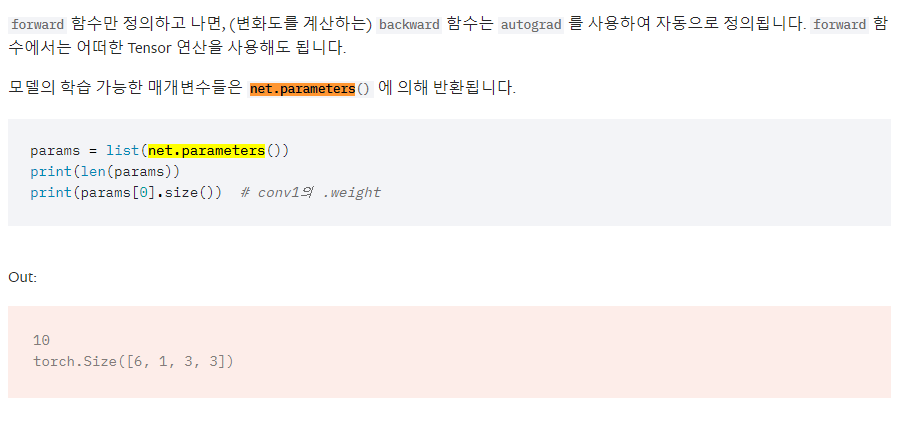 위 코드는 간단한 CNN 신경망을 설계하는 코드이다. 생성자(__init__)에서는 레이어에 사용될 요소들을 정의한다. (정의하기만 할 뿐 연결이 된것은 아님!) Net 클래스는 nn.Module 클래스를 상속받는데, nn.Module 클래스의 forward() 메소드를 오버라이딩 한다. 이 메소드는 생성자에서 정의한 요소들을 실질적으로 연결(구현)하는 과정이다.