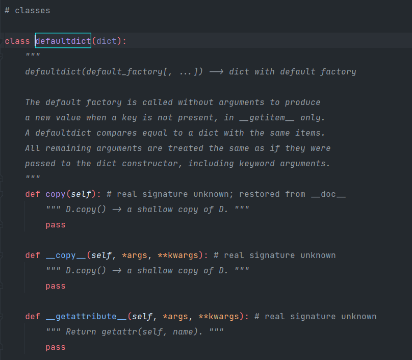 - setdefault 메소드를 통해 참조와 동시에 기본값을 할당받는 방법도 있지만, collections 패키지의 defaultdict 클래스를 활용한 방법도 있다. defaultdict 클래스는 정확히는 dict 타입은 아니고 dict 클래스를 상속받는 하위 클래스다.