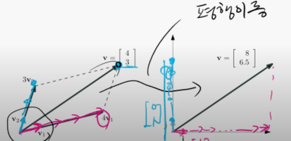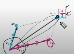 하지만 좌표계가 무조건 직교할 필요는 없다. 좌측 하단의 v1, v2 벡터를 기저(기초가 되는)로 하는 좌표계가 있을 수도 있다. v 벡터는 v1을 4번, v2를 3번 이동한 방향으로 향한다. 즉, 해당 벡터 v는 v1, v2를 기저로 하는 좌표계에서 (4, 3)의 좌표값을 가지게 된다.