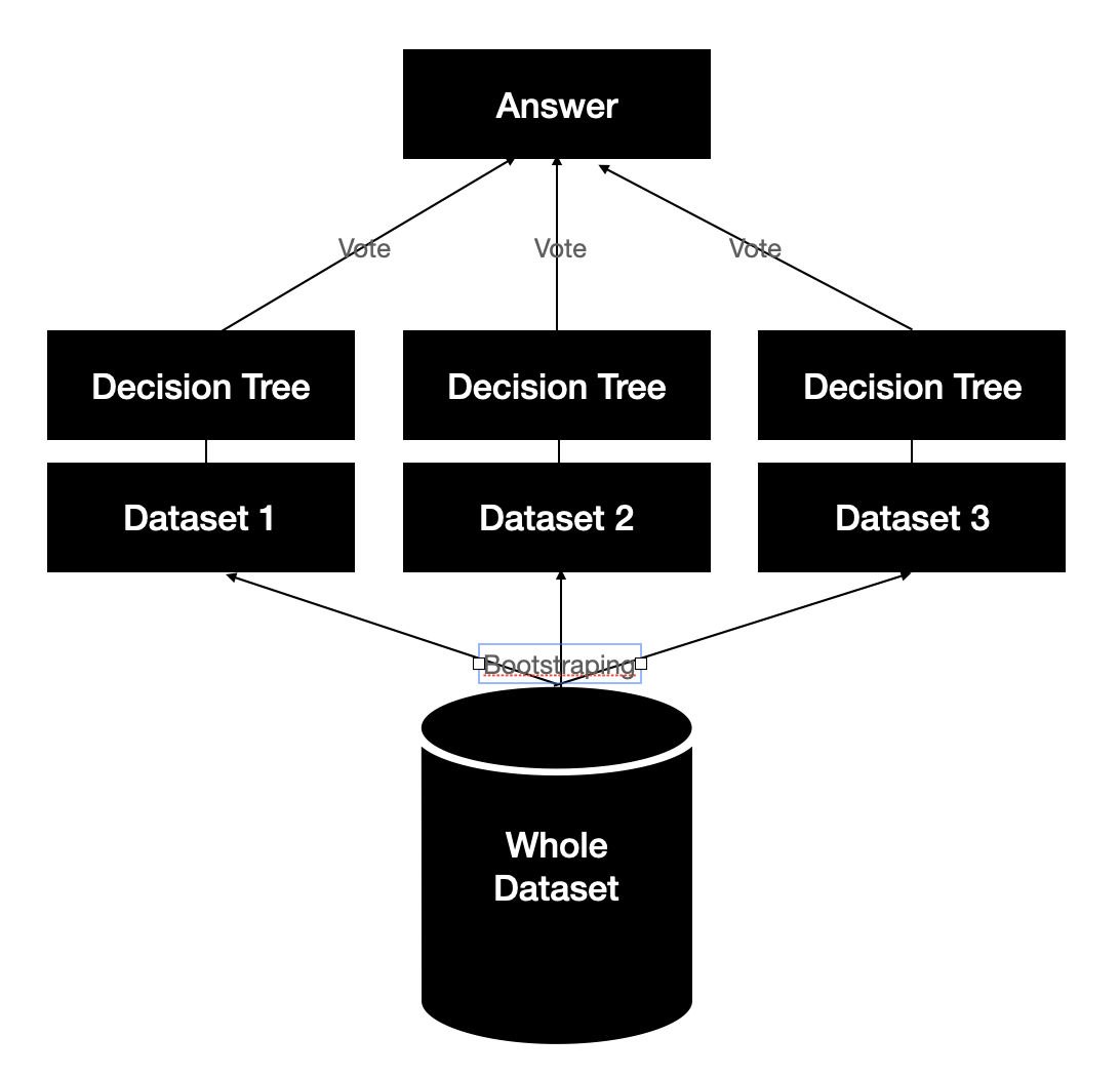 특징 2 : 전체 데이터 셋에 대하여 Bootstraping sampling (복원 추출)을 통해 얻은 샘플 데이터셋들을 각각의 분류기에 적용