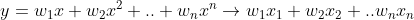 여기까지 선형과 비선형에 대해 알아보았다. 마지막으로 그럼 그림 1에서 어떻게 곡선이 나왔을까? 사실 여태까지 선형 회귀 방정식들은 선형 조합의 형태로 치환한 것이다. 예를 들어보자.