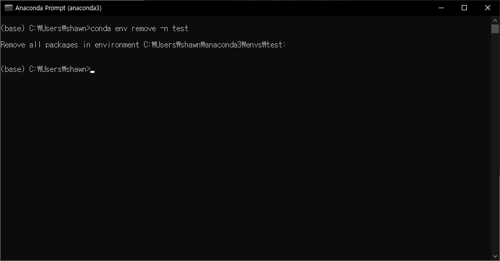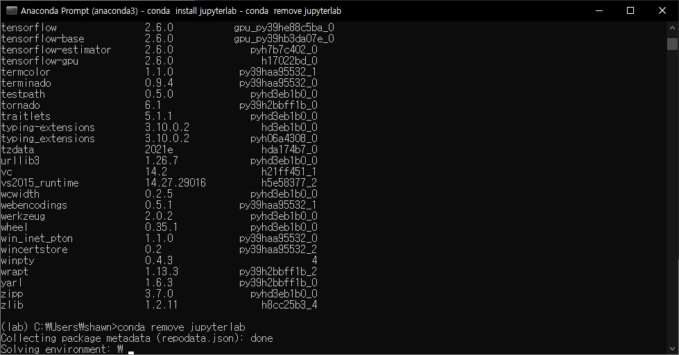 현재 활성화된 가상환경에서 원하는 패키지를 제거한다. conda list를 통해 설치된 패키지 목록을 출력하고 해당 목록에서 삭제하기를 원하는 패키지이름을 입력한다.