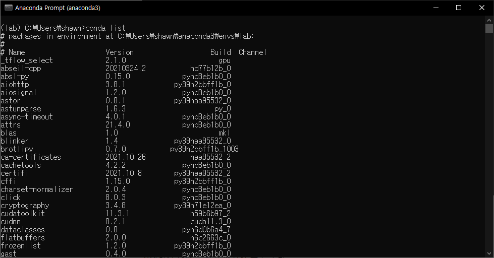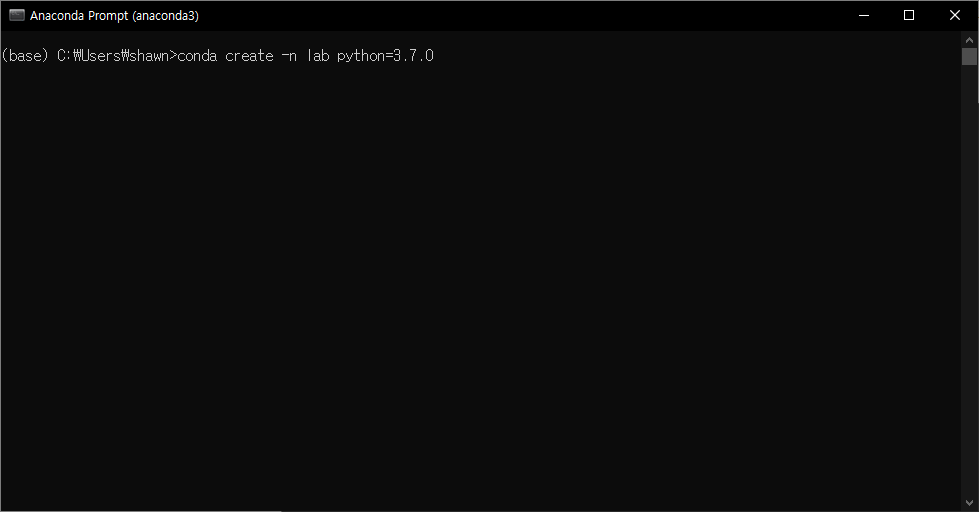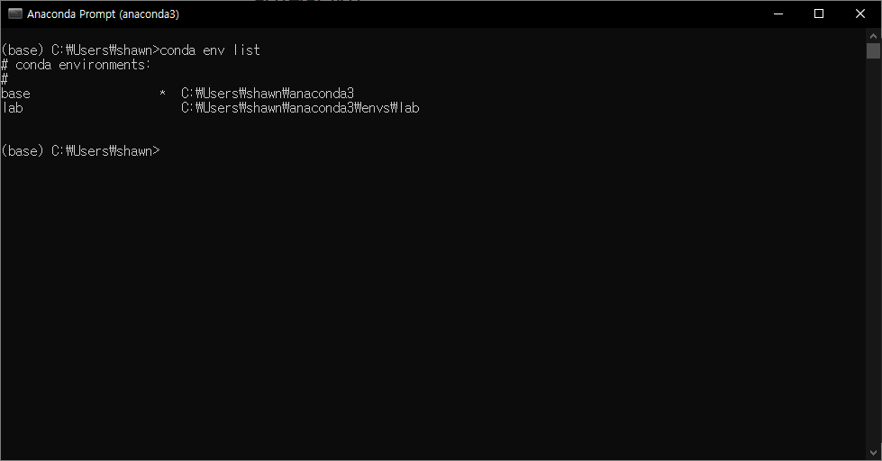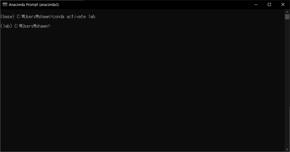 해당 가상환경을 활성화한다. 좌측에 (base) 가상환경에서 (lab) 가상환경으로 바뀐것을 확인할 수 있다.